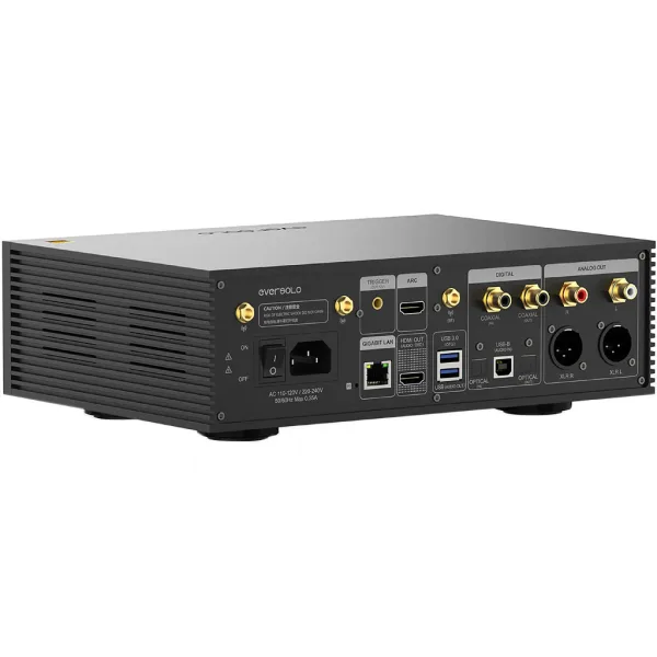 - Išėjimai: analoginiai (RCA), balansiniai (XLR), COAXIAL, OPTICAL, HDMI, USB (A)